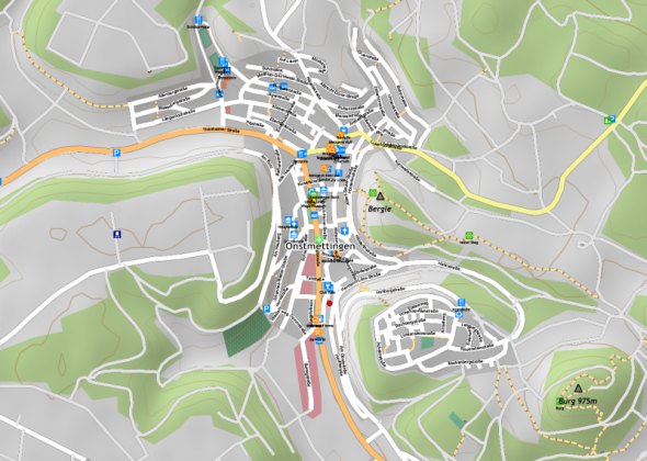 verkleinerte Ansicht einer 3D Landkarte von Onstmettingen mit Höhenlinien. Erstellt wurde diese mit dem Kosmos-Renderer.